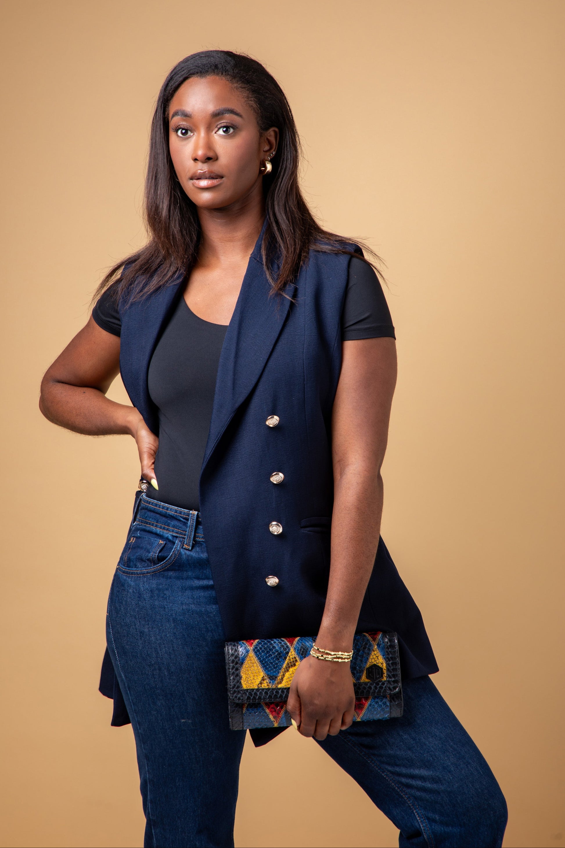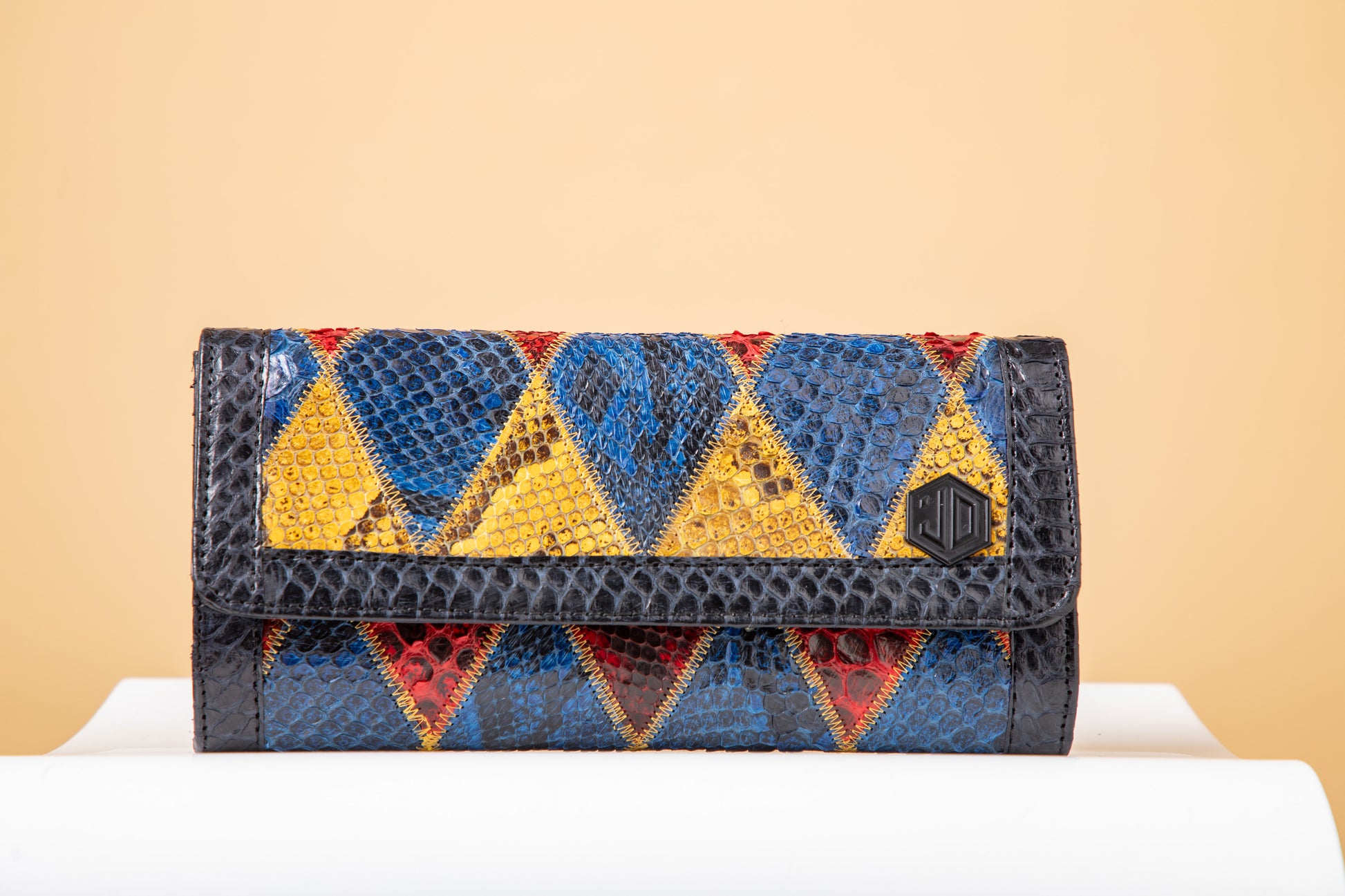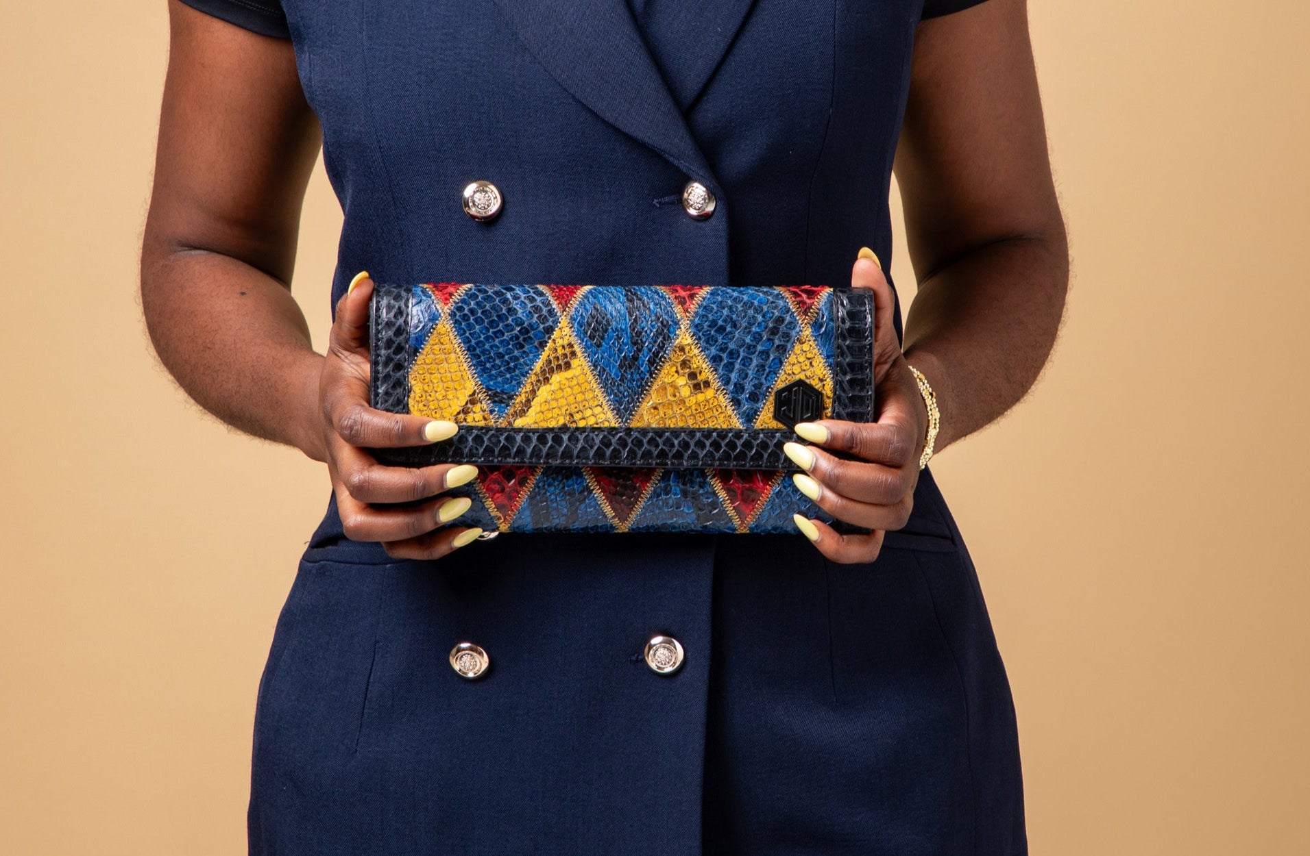 Each clutch is constructed from carefully selected, diamond-cut panels of genuine python leather, hand-stitched into a mosaic of colour and texture. The result? A bold yet versatile piece that shifts effortlessly between day and evening, minimalism and maximalism, Lagos and London.