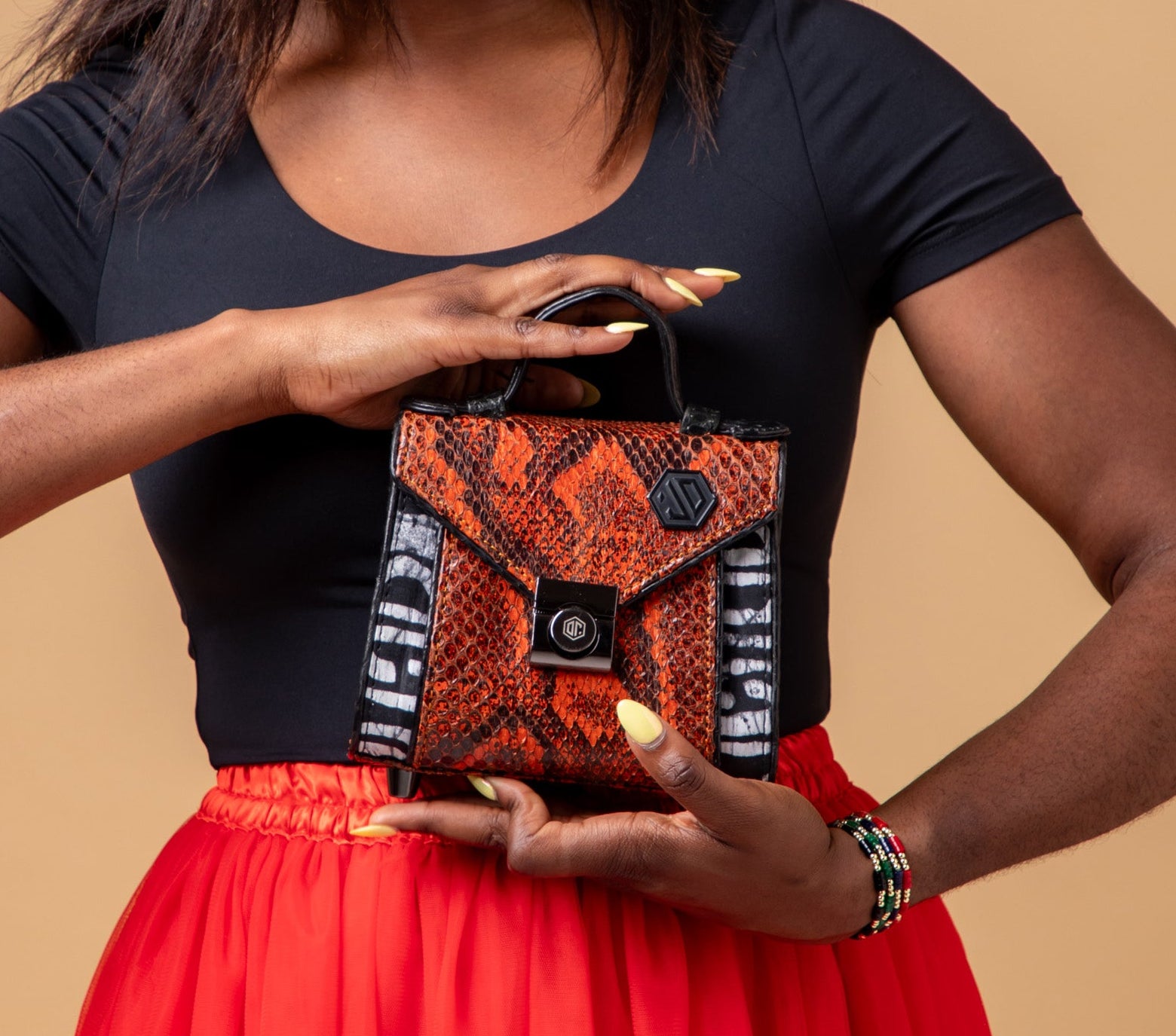 What sets ÀṢÀ apart is its interchangeable flap system: the bag comes with two distinct tops — one in python leather, the other with a hand-braided handle and Adire fabric — that can be zipped on or off. This makes ÀṢÀ not just a bag, but a wearable canvas for cultural storytelling. Future flaps will be available in new colours and textures, allowing collectors to personalise and evolve their bags over time.